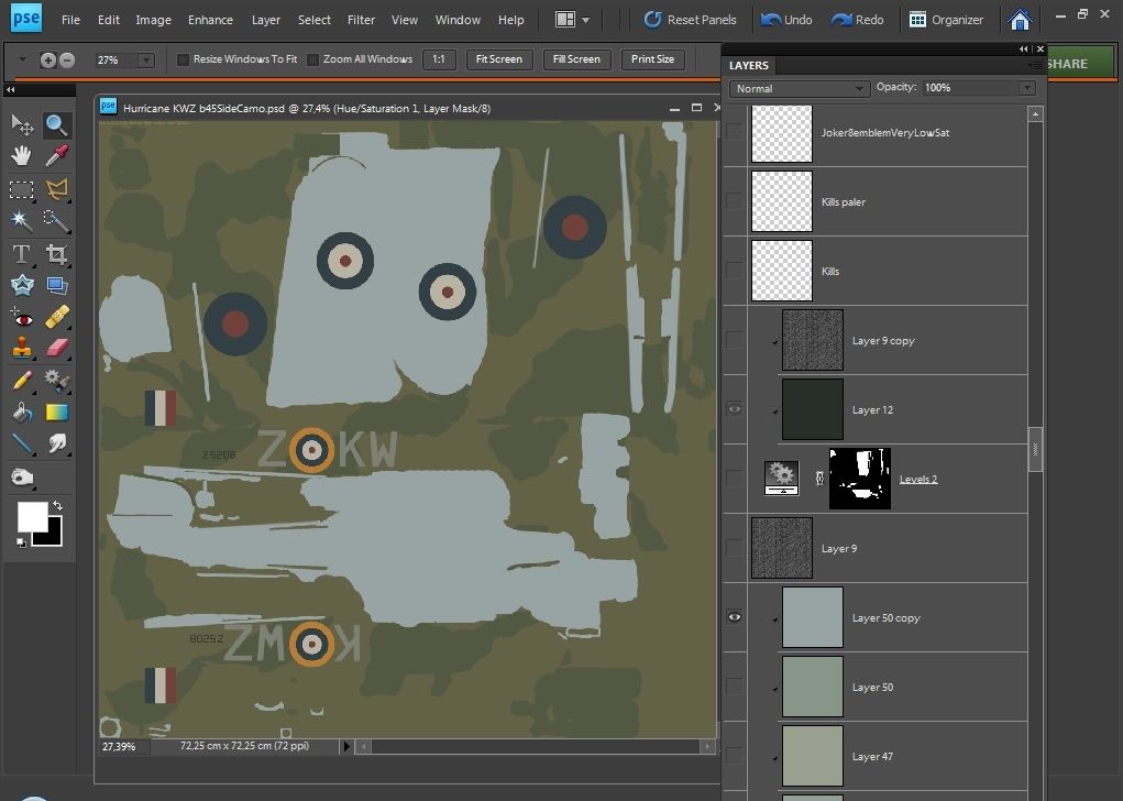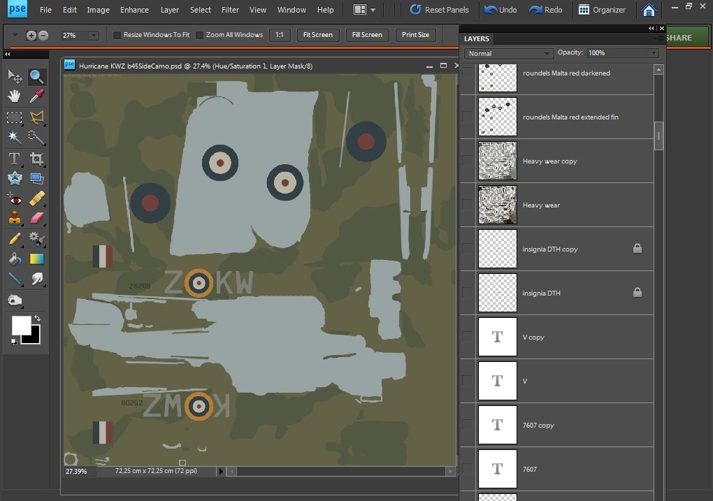 I did the skin on request. Mysticpuma at ATAG forum wanted it in order to make a video. If I recall correctly he may also want to show the video to the pilot (excuse me if I'm wrong). Here is the thread from the ATAG forum. If you contact Mysticpuma he will know a great deal more about this particular aircraft than I do: http://theairtacticalassaultgroup.co...ad.php?t=16820 I use my own templates which are based on the official ones. They are a complete mess. This one has 150 layers, all with various colours and code numbers. Most layers are old and un-used, including the weathering layers. Layers examples: http://i4.photobucket.com/albums/y12...1.jpg~original http://i4.photobucket.com/albums/y12...1.jpg~original I've been trying to get a worn looking Hurricane skin. But I find it's difficult to get weathering to look right together with plane shine, and can only get the underside to look right. It's very frustrating, but I'll keep trying... http://i4.photobucket.com/albums/y12...5.jpg~original Cheers, Setback |