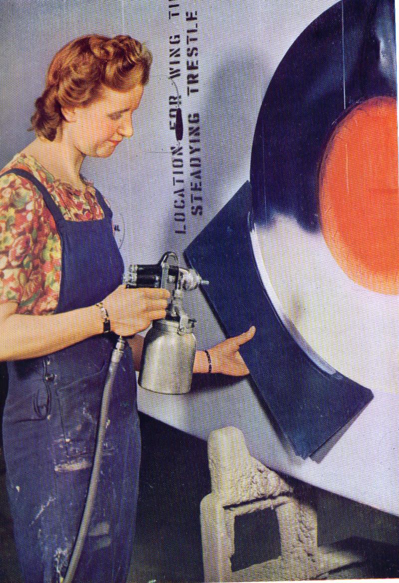 ![]() Caption reads: 'Painting the roundels on the wing of a Spitfire. "This neat and housewifely woman is the mother of three children..." from 'British Women Go to War'; photo: P G Hennell; Collins, London.' .